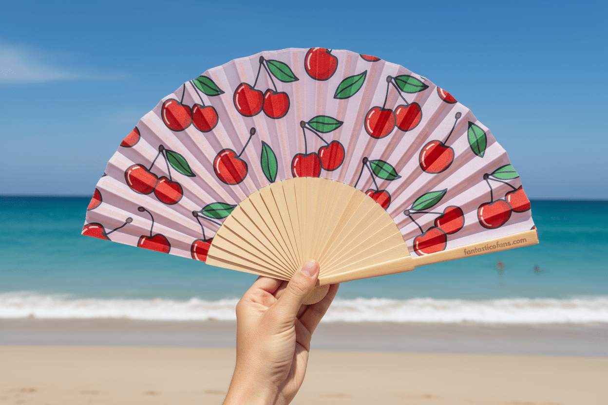Stay cool in style with the Cherries 23cm fan in pretty pink. Its cute design featuring iconic Ibiza cherries will add a touch of fun to any outfit. Don't sweat the heat, just chill with this quirky accessory!