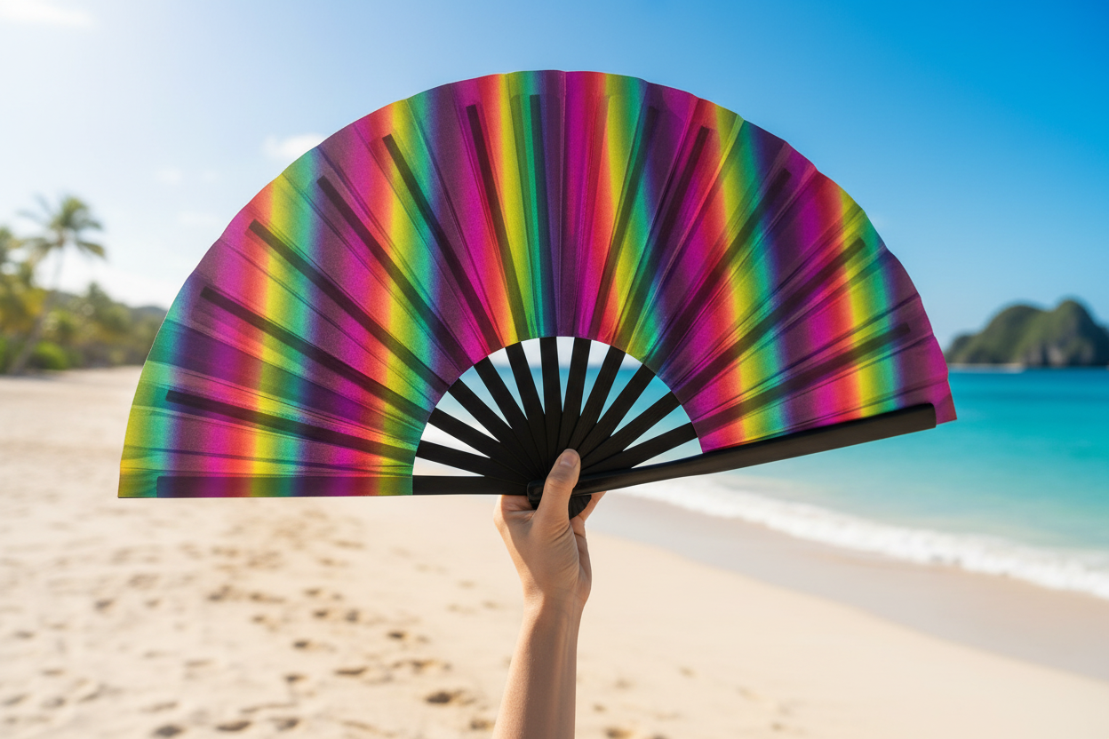Radiate pure spectrum magic with this stunning holographic rainbow XL fan. Every rotation unleashes a kaleidoscope of iridescent light that shifts and shimmers across surfaces. Oversized and impossible to ignore, it's a statement piece that refuses subtlety. Whether you're cooling down or commanding attention, this fan transforms the ordinary into the extraordinary. Bold, luminous, unforgettable.