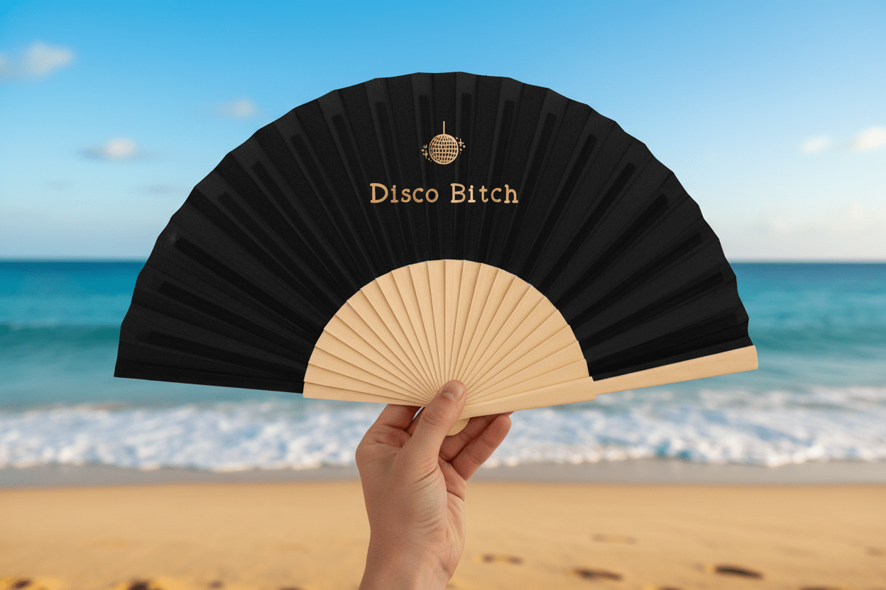 Sparkle, strut, repeat. This 23cm fan channels pure disco energy with a glittering discoball icon rendered in eye-catching metallic print. Unapologetically fun and fearlessly fabulous, it's made for those who live for the spotlight. Slip it into your bag and let it do the talking—because subtlety is so last season.