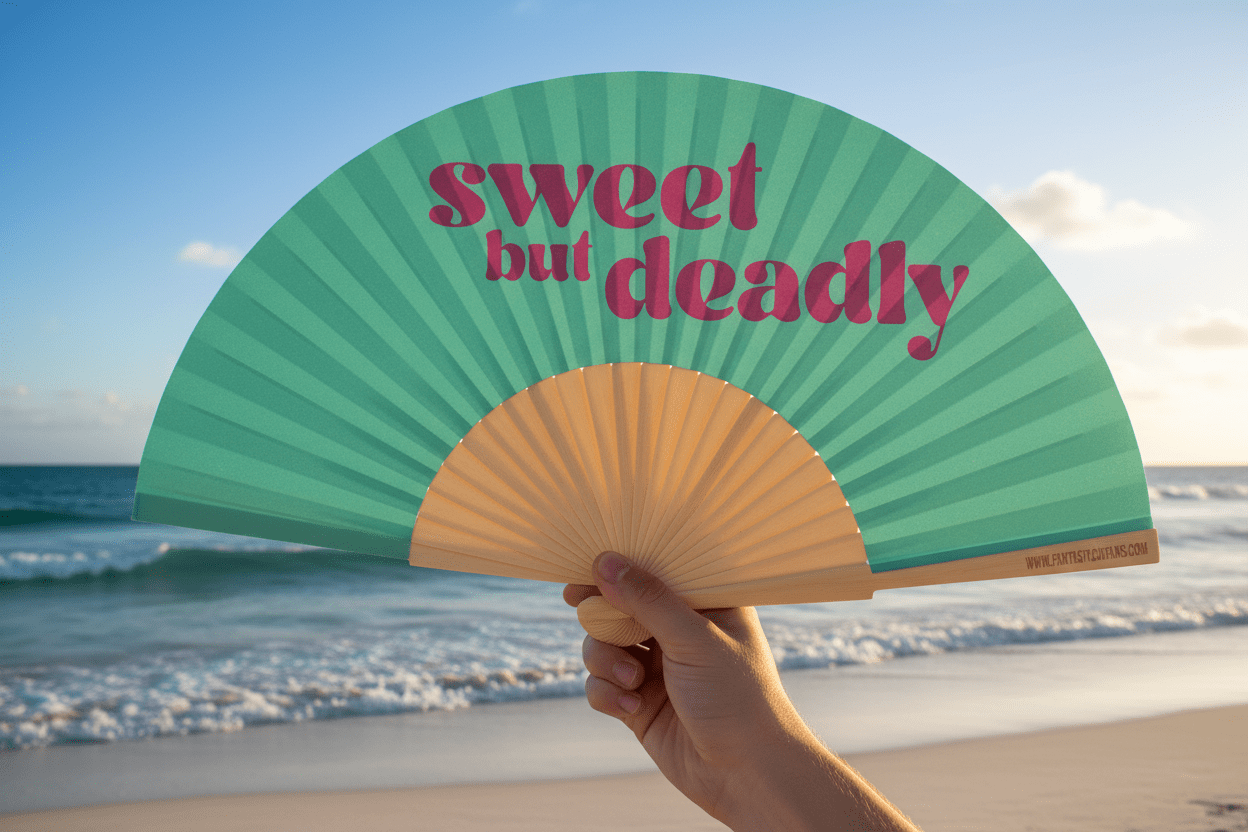 Don't let the sweetness fool you. This 23cm fan pairs "Sweet But Deadly" with an edge that cuts deeper than it looks. Cheeky, layered, and full of hidden meaning, it's for those who know that the most dangerous people are the ones who smile while they do it. Compact, clever, and unapologetically complex.